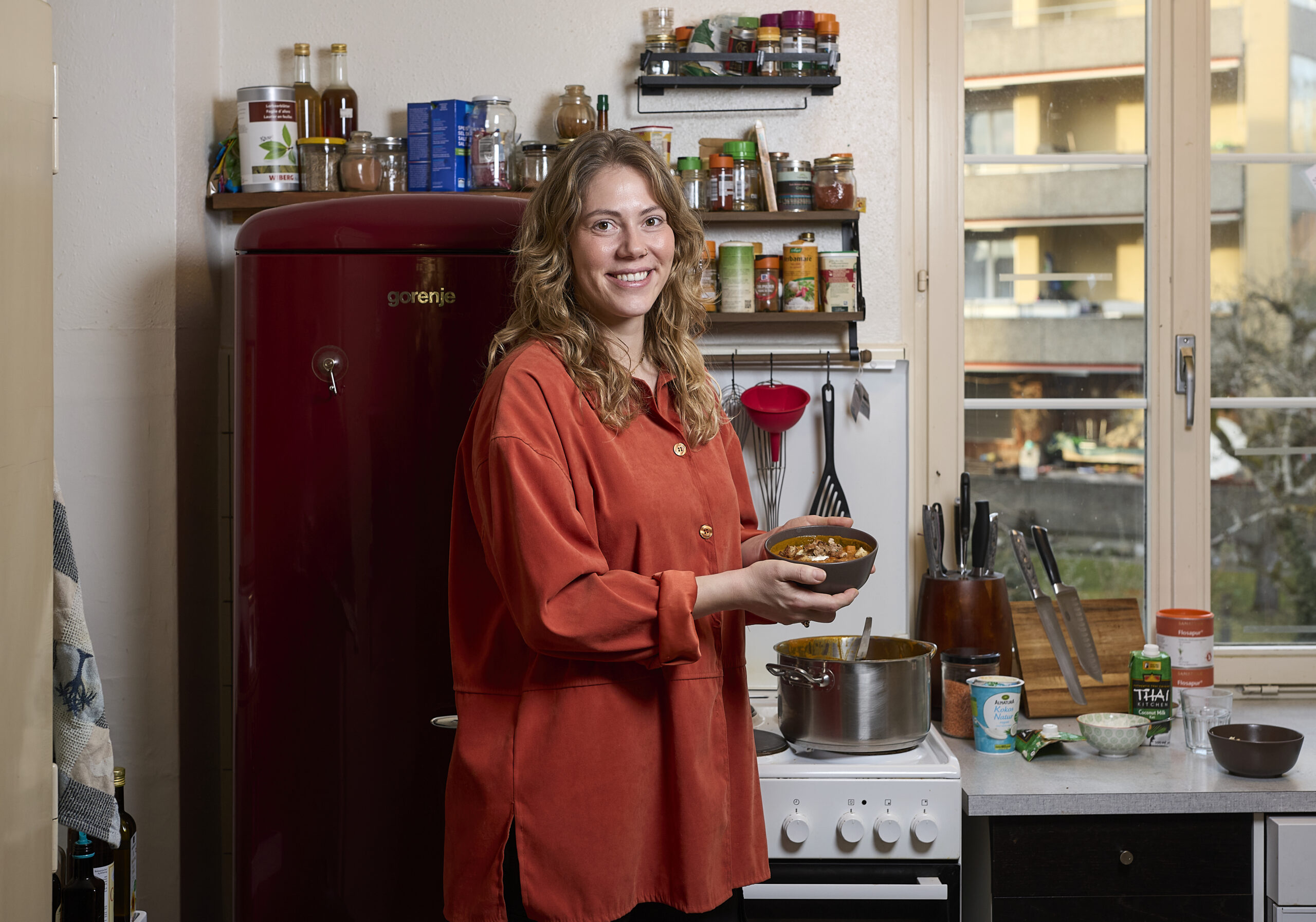 Besonders junge Leute essen nicht regelmäßig daheim, was eine wöchentliche Menuplanung schwierig macht. Resten vom Vortag wandern im Kühlschrank unter Umständen immer weiter nach hinten, bis sie entsorgt werden müssen. «Wenn man drei Mahlzeiten pro Woche einplant, kommt man mit einer kreativen Restenküche weit», sagt Elena Meister und empfiehlt dafür ein orientalisch-indisches Curry mit Paneer oder Tofu, «weil mehrere Geschmacksrichtungen reinpassen». So viel vorneweg: Der Resten-Eintopf mit kunterbunten Zutaten, den Elena der Links-Redaktion auftischt, schmeckt grossartig – zur Nachahmung wärmstens empfohlen, auch mit Gästen.